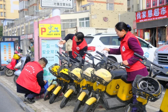 六安北中心“大別山保暢先鋒”走上街頭將共享單車擺放整齊