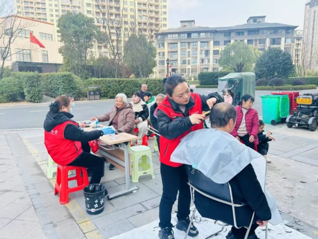 地產(chǎn)集團(tuán)物業(yè)公司團(tuán)支部組織青年志愿者在小區(qū)免費(fèi)為業(yè)主測量血壓、血糖,并提供便民理發(fā)等服務(wù)
