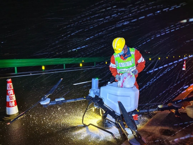 亳州中心蒙城保暢分中心工作人員在雙澗樞紐使用無人機(jī)撒布融雪劑