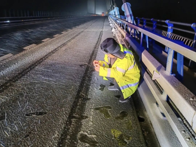 徐明中心五河分中心工作人員查看淮河特大橋橋面積水結(jié)冰情況