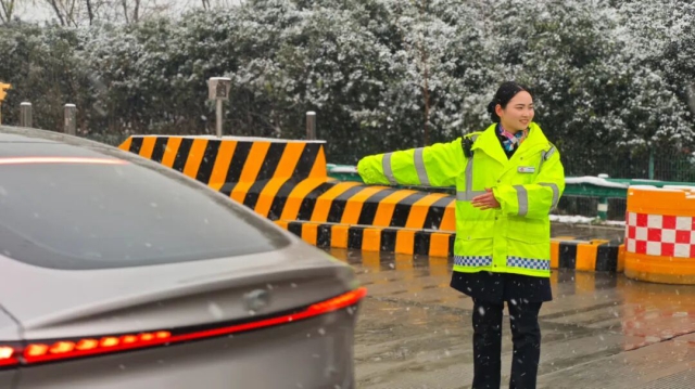 淮南中心鳳臺北站收費(fèi)人員為車輛清理車牌積雪