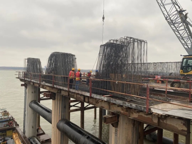 交控資源公司東流港口碼頭施工隊(duì)伍正在進(jìn)行鋼筋綁扎