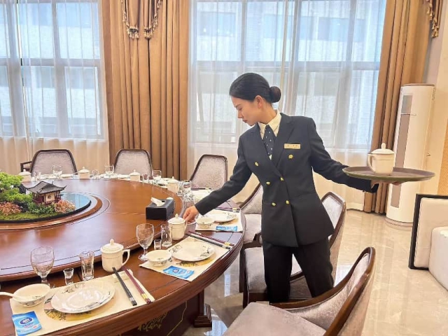 酒店公司金牌服務(wù)隊(duì)貼心管家正在準(zhǔn)備餐具