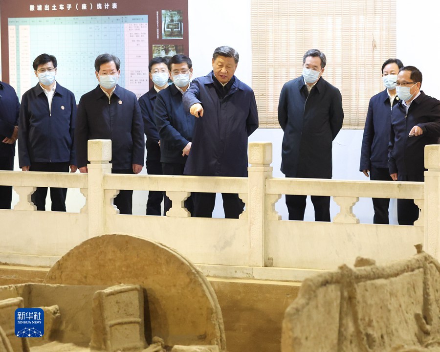 28日下午,習(xí)近平考察了位于安陽市西北郊洹河南北兩岸的殷墟遺址。殷墟是我國歷史上第一個文獻可考、為考古發(fā)掘所證實的商代晚期都城遺址。習(xí)近平步入殷墟博物館,仔細觀摩青銅器、玉器、甲骨文等出土文物。隨后,習(xí)近平來到車馬坑展廳,察看商代畜力車實物標本和道路遺跡。他指出,殷墟出土的甲骨文為我們保存3000年前的文字,把中國信史向上推進了約1000年。殷墟我向往已久,這次來是想更深地學(xué)習(xí)理解中華文明,古為今用,為更好建設(shè)中華民族現(xiàn)代文明提供借鑒。中國的漢文字非常了不起,中華民族的形成和發(fā)展離不開漢文字的維系。在這方面,考古事業(yè)居功至偉??脊殴ぷ饕^續(xù)重視和加強,繼續(xù)深化中華文明探源工程。中華文明源遠流長,從未中斷,塑造了我們偉大的民族,這個民族還會偉大下去的。要通過文物發(fā)掘、研究保護工作,更好地傳承優(yōu)秀傳統(tǒng)文化。習(xí)近平強調(diào),中華優(yōu)秀傳統(tǒng)文化是我們黨創(chuàng)新理論的“根”,我們推進馬克思主義中國化時代化的根本途徑是“兩個結(jié)合”。我們要堅定文化自信,增強做中國人的自信心和自豪感。
